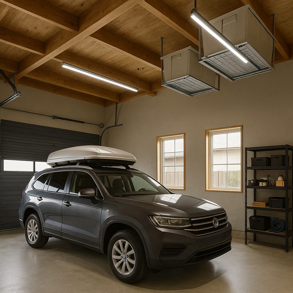また、高さを活かして吊り下げ式の収納を設ければ、アウトドア用品やタイヤを効率よく保管でき、ガレージがより機能的な空間になります。