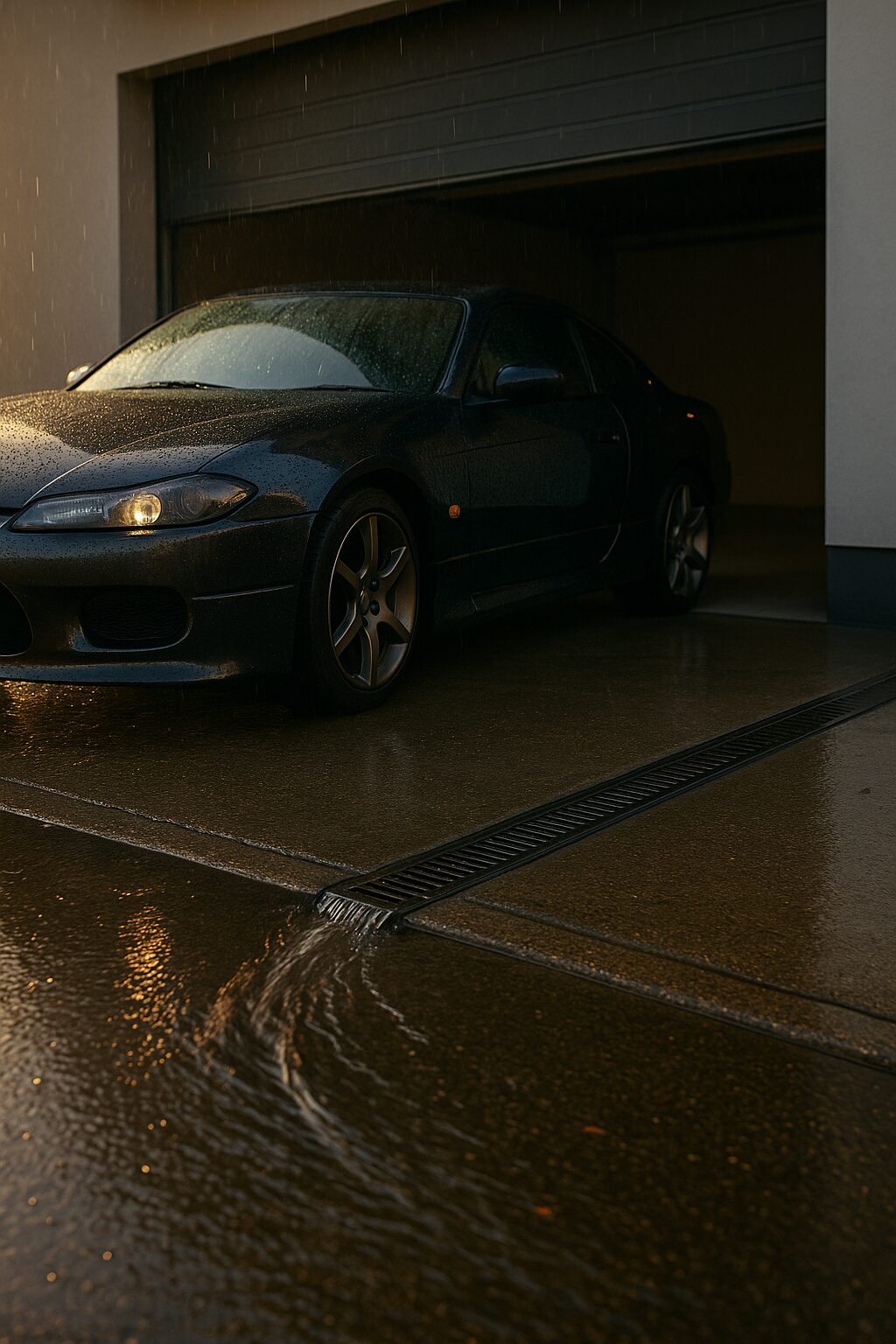 ガレージは屋内とはいえ、車についた雨水、洗車後の流れ、湿気、さらには豪雨時の逆流など、水との相性が非常にシビアな空間です。