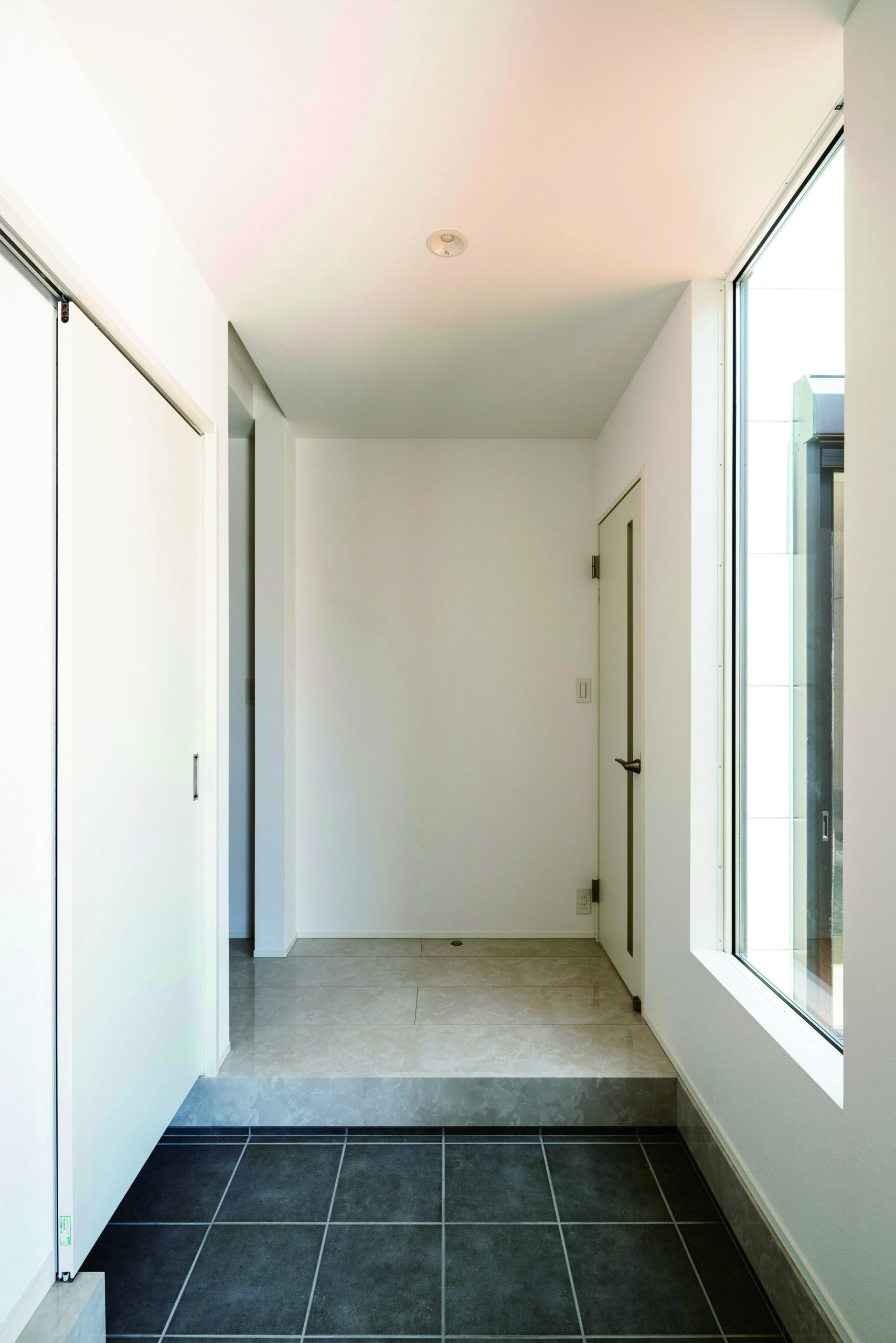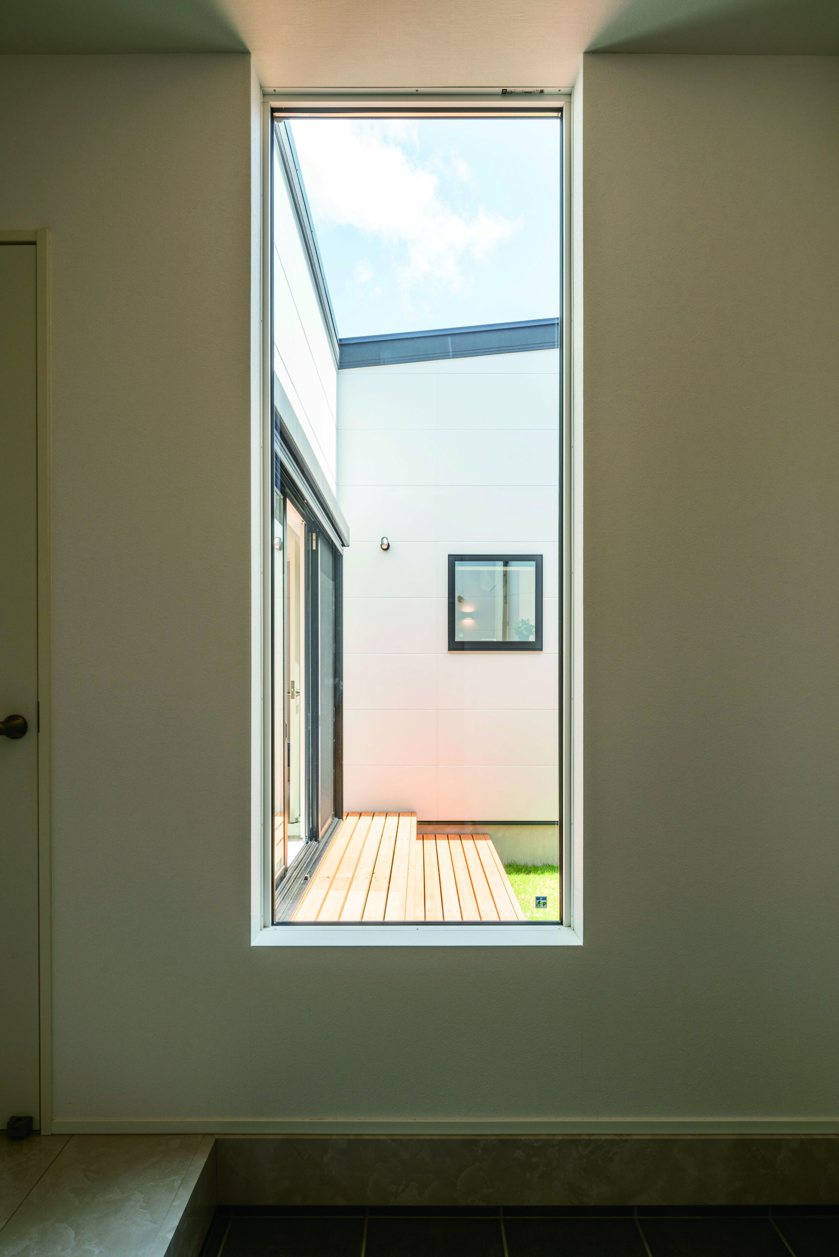 外から見ると窓が少なくて「中、暗いのかな?」って思われがちだけど、答えは中庭。玄関からフィックス窓越しに光が入って、気持ちがいい。