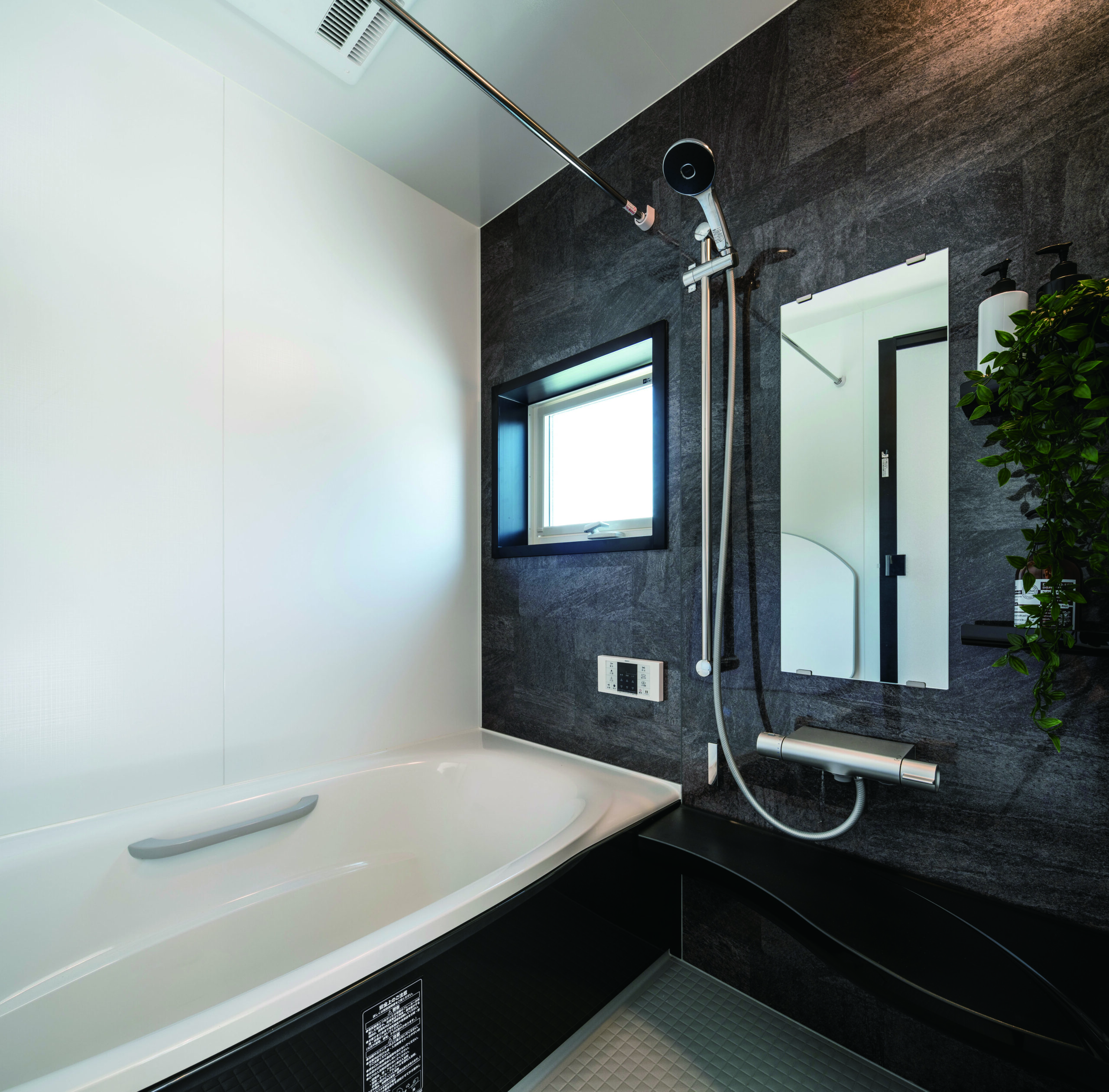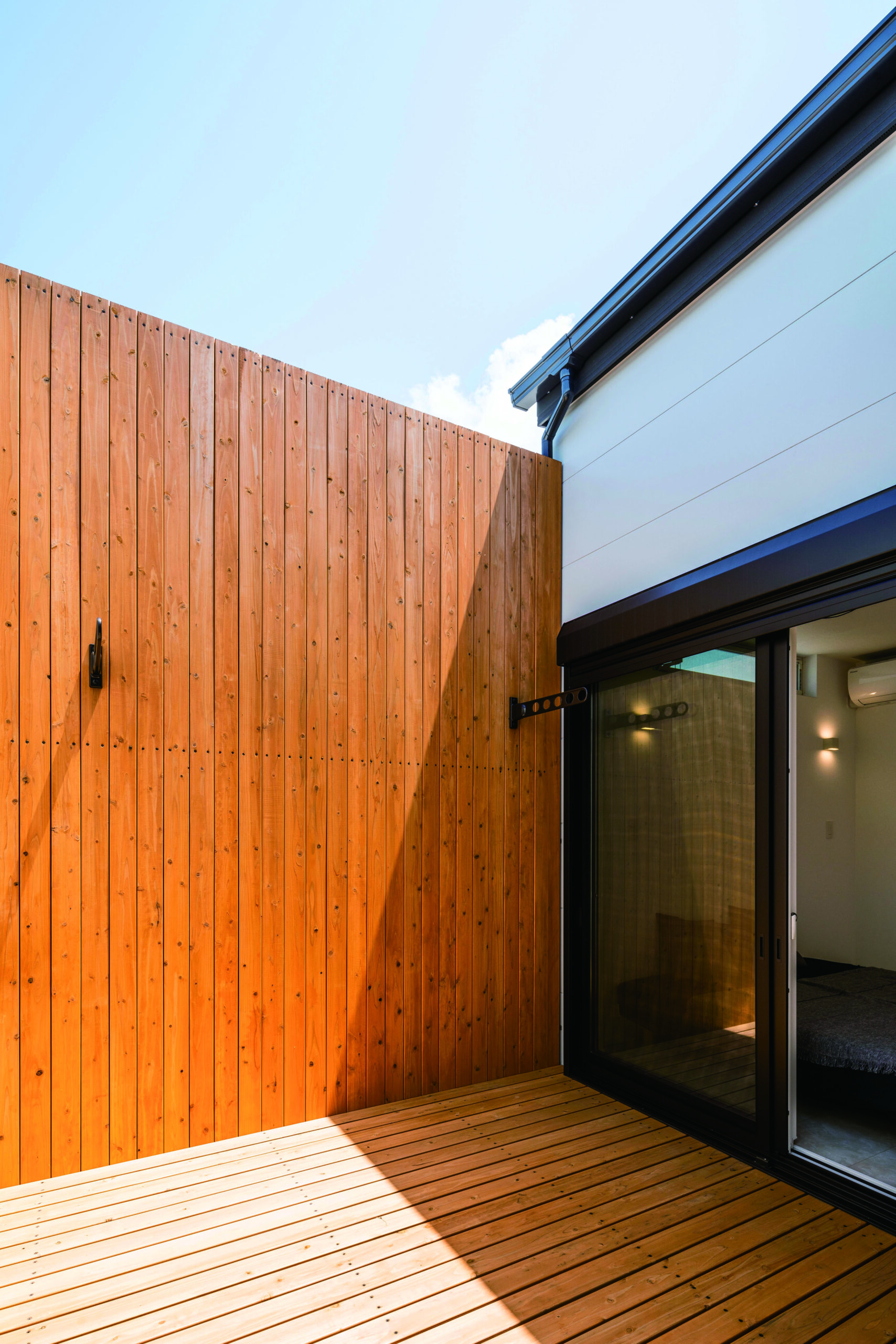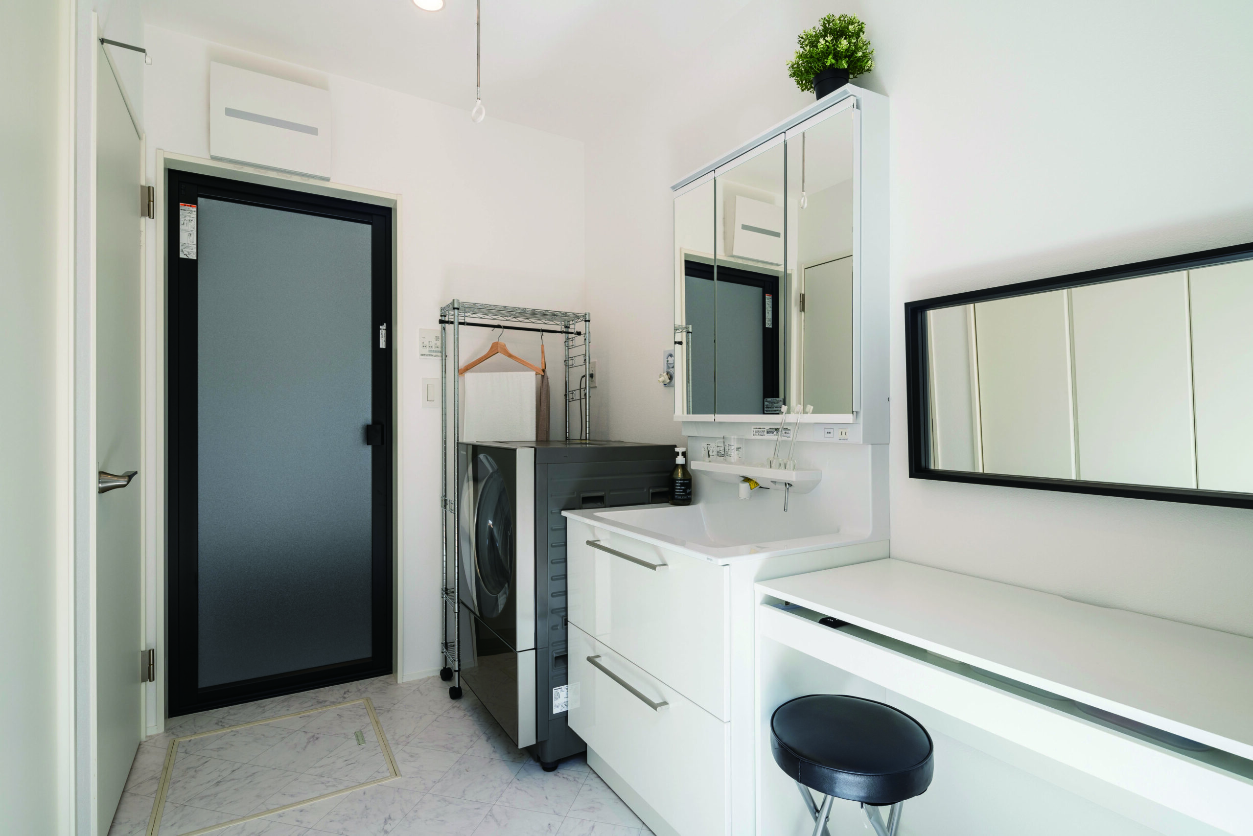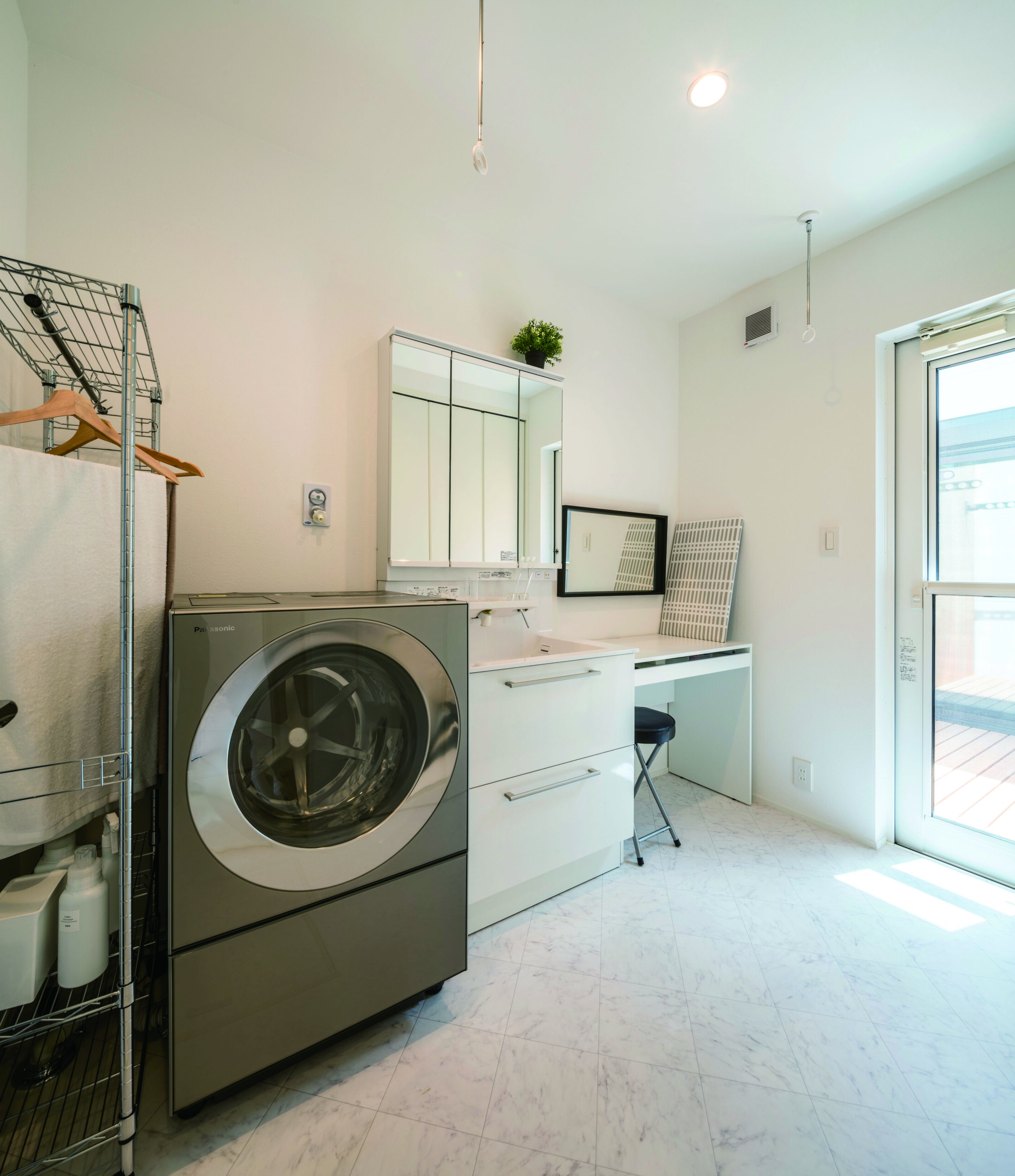 洗面〜お風呂は、洗濯して・干して・取り込んで・畳むまでが同じ場所で完結する設計。中庭に面しているから、スクリーン越しに光と風を取り込みつつ、外からの視線はしっかりカット。洗濯物を取り込んだら、その場でサッと畳めるので、“取り込んだ洗濯物がリビングに山積み”が起きません。