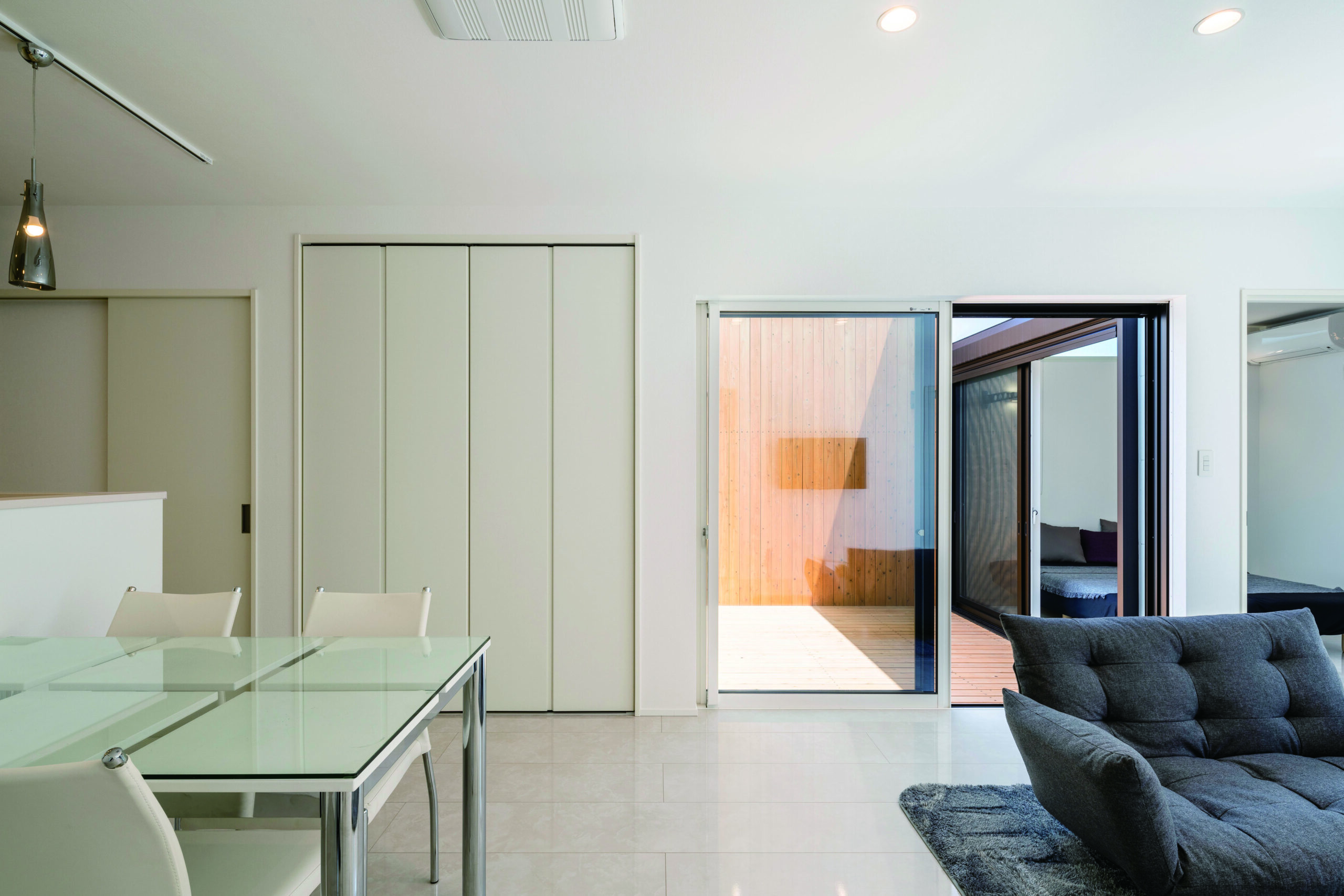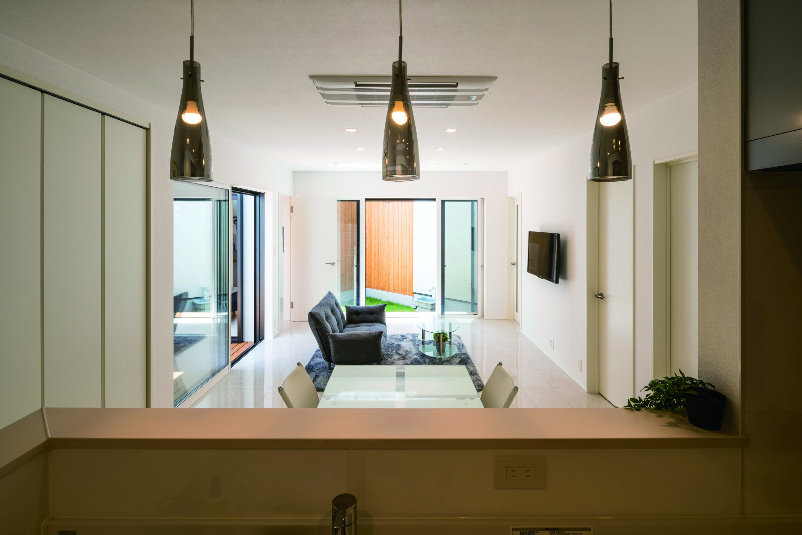 リビング自体は大きすぎないのに、中庭が2か所あることで視線が抜けて、体感が広いのも気持ちいいポイント。