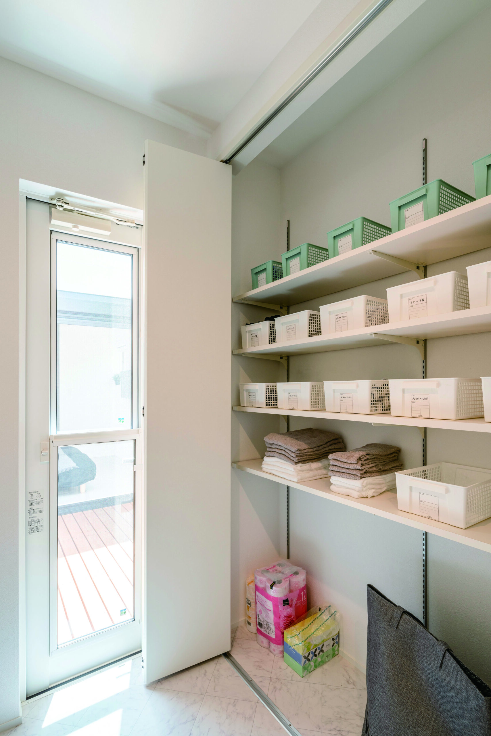 リビング背面の収納と隣り合わせにしてあるから、タオル・洗剤・日用品・ストック類が迷子にならない。生活感が出やすいエリアなのに、動線と収納がセットで組まれているので、片付けが“頑張る作業”じゃなくて“流れ”になる。
