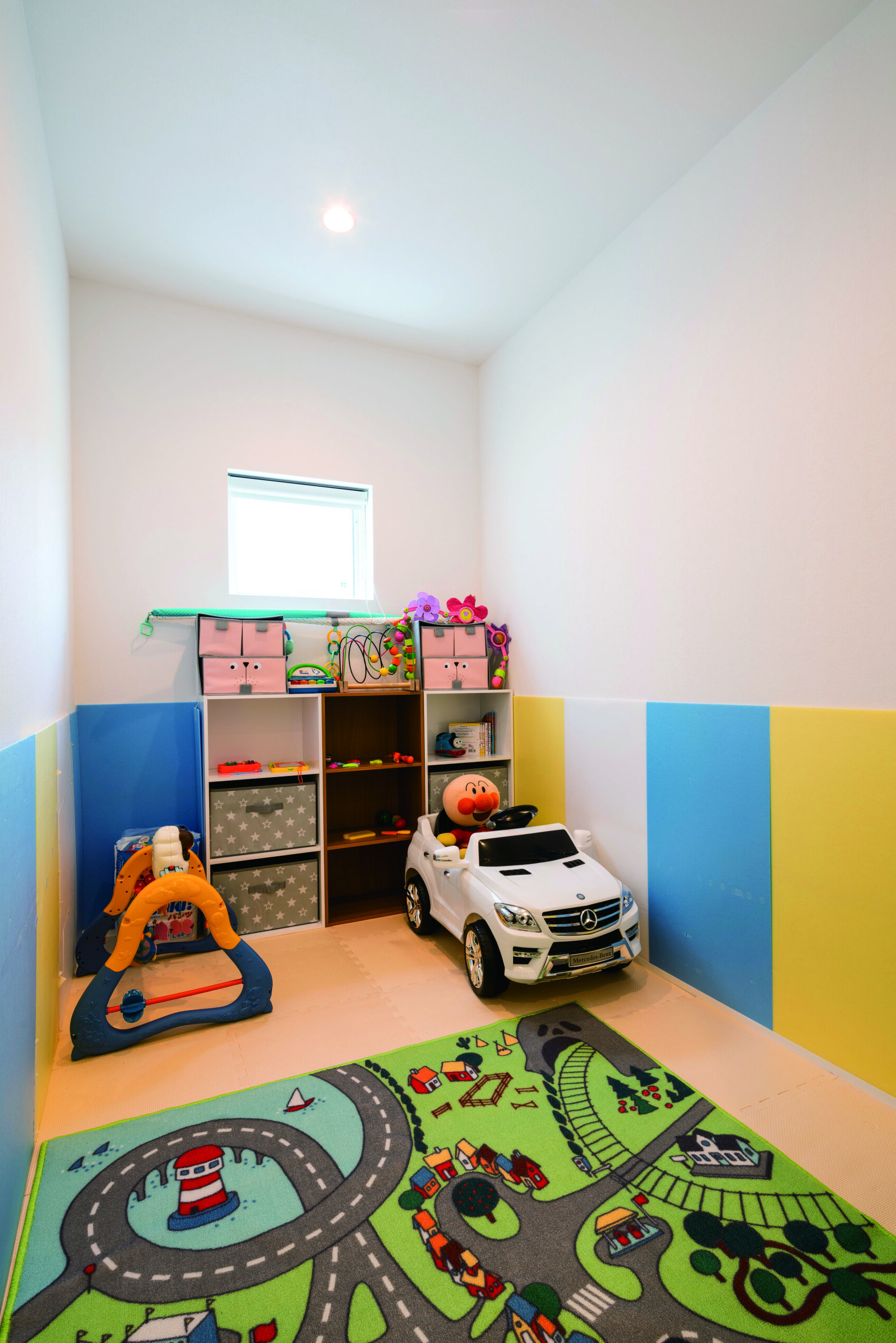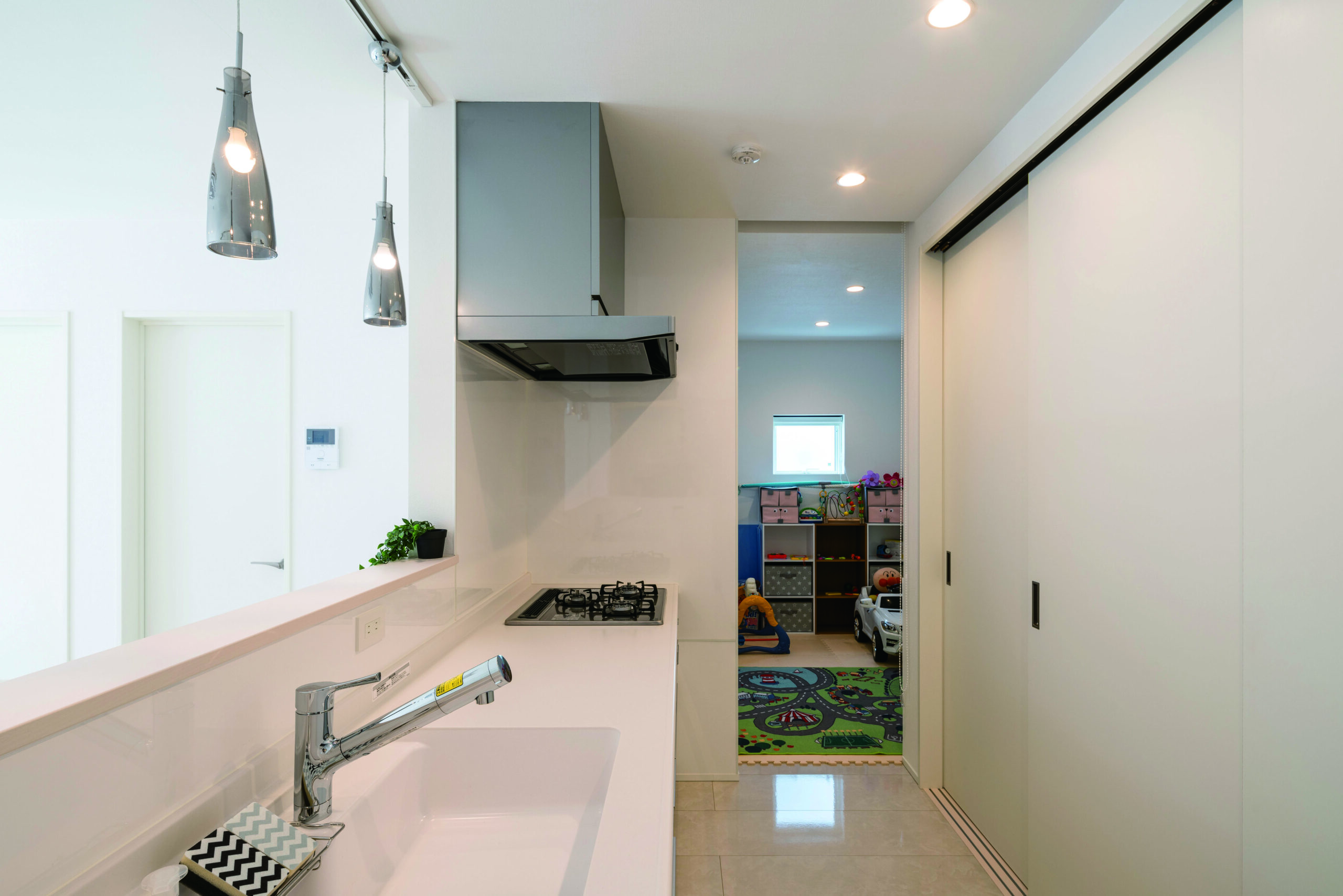 キッチン奥の“本来パントリーになりそうな場所”は、子どもが小さい今はキッズスペース。料理しながら目が届く距離感が、いちばん現実的に助かるやつ。成長に合わせて必要なくなったら食品庫として活用します。