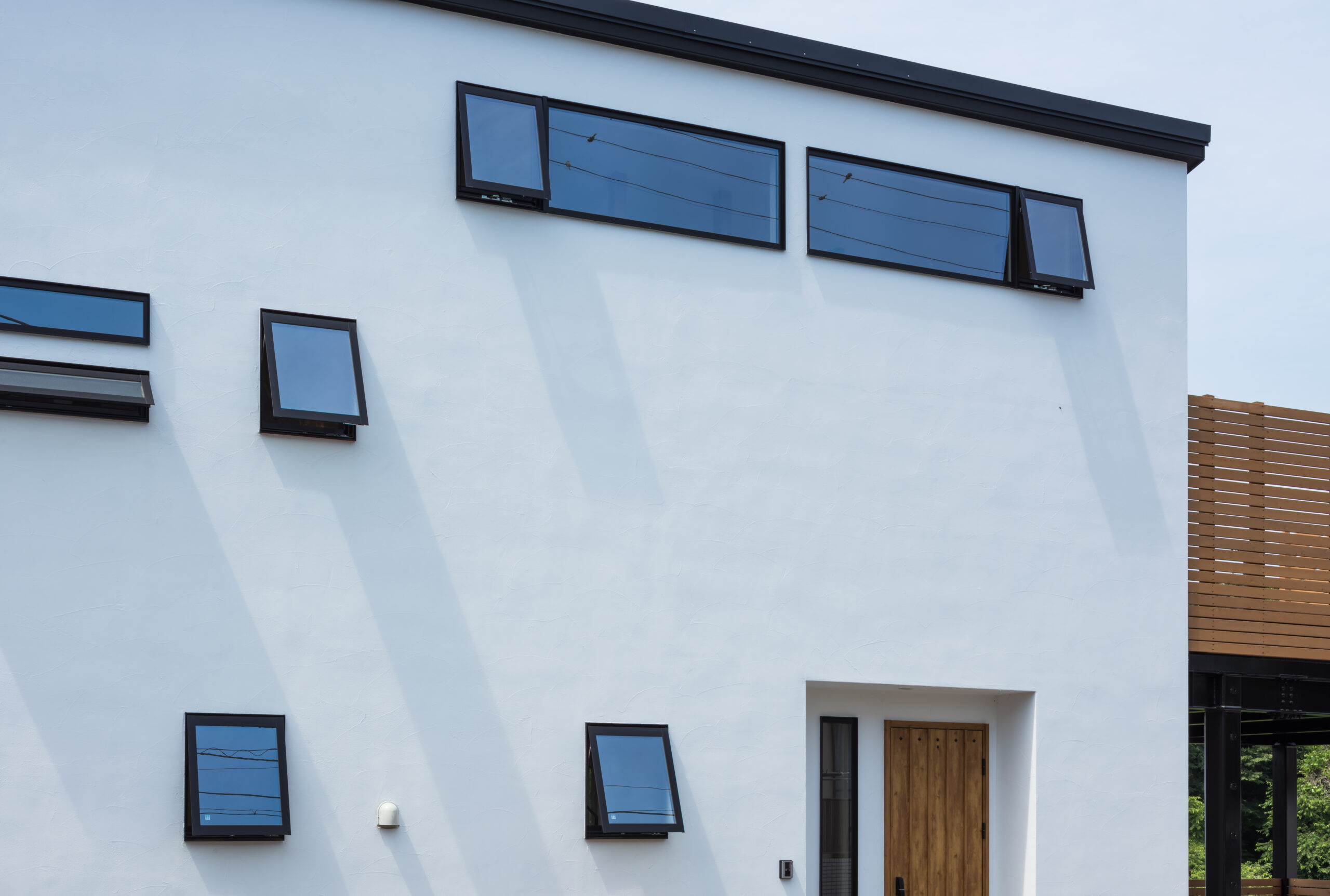 鉄骨手すりの階段や、連続して並ぶ横長の窓、大開口のアコーディオン式サッシなど、細部まで印象的なデザインを取り入れました。