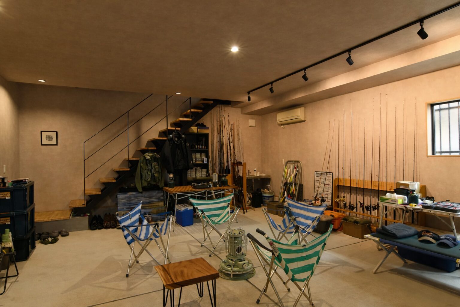 道具を整え、空間を楽しみ、上下階の動線もスマートに。ガレージを“基地”として成立させる象徴的な存在です。